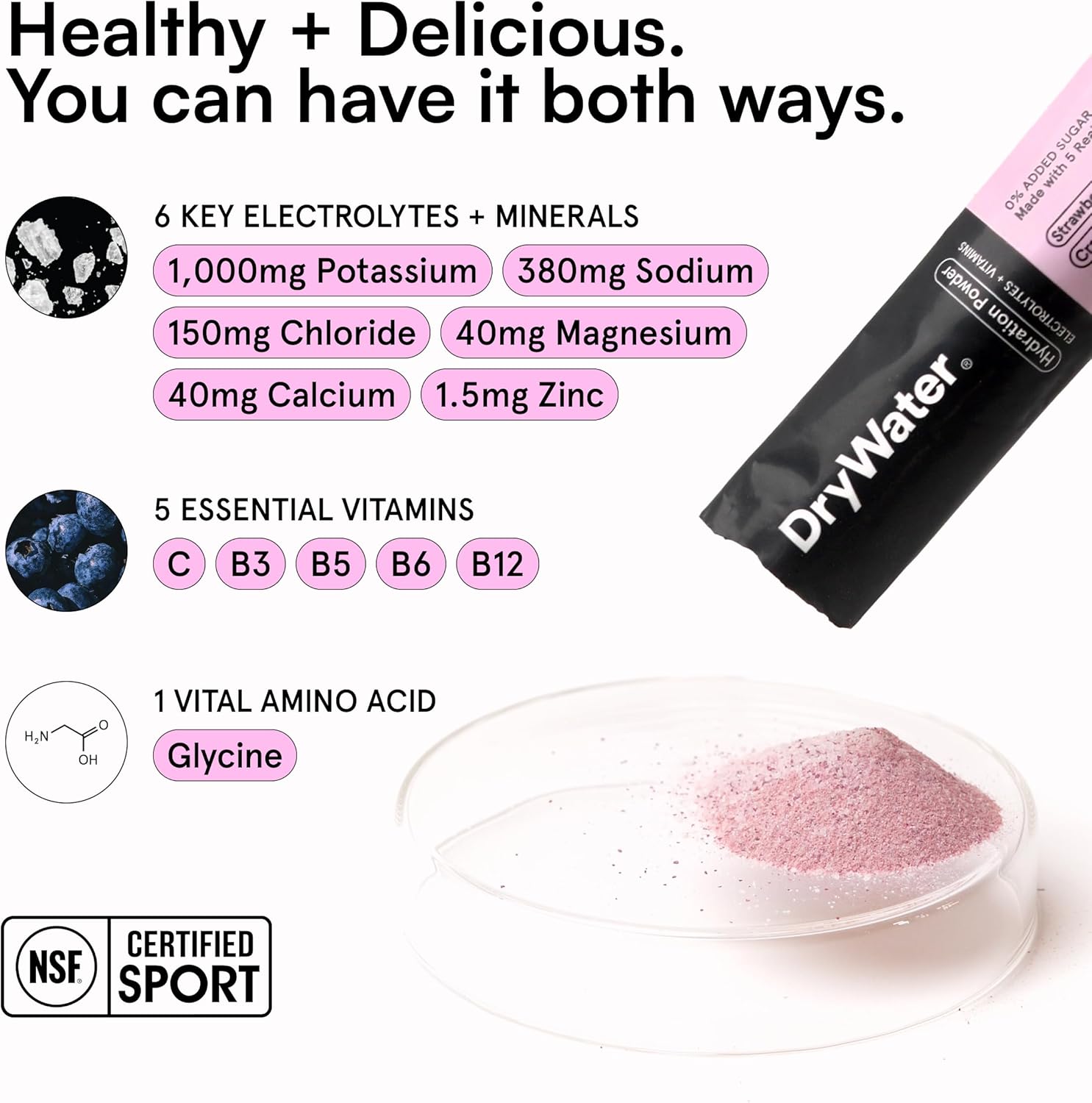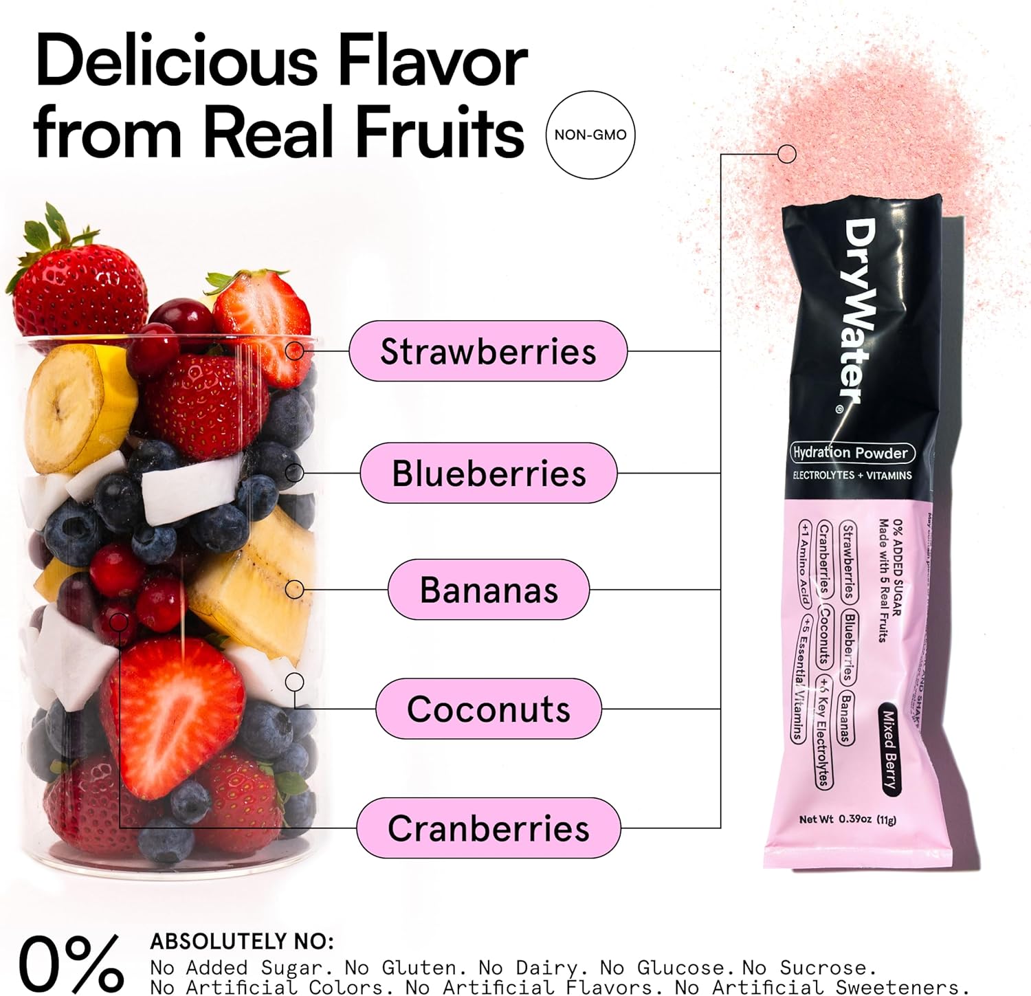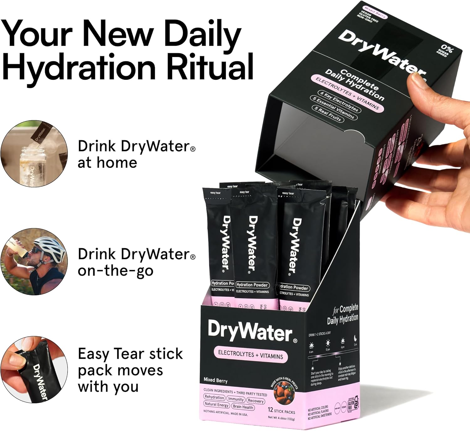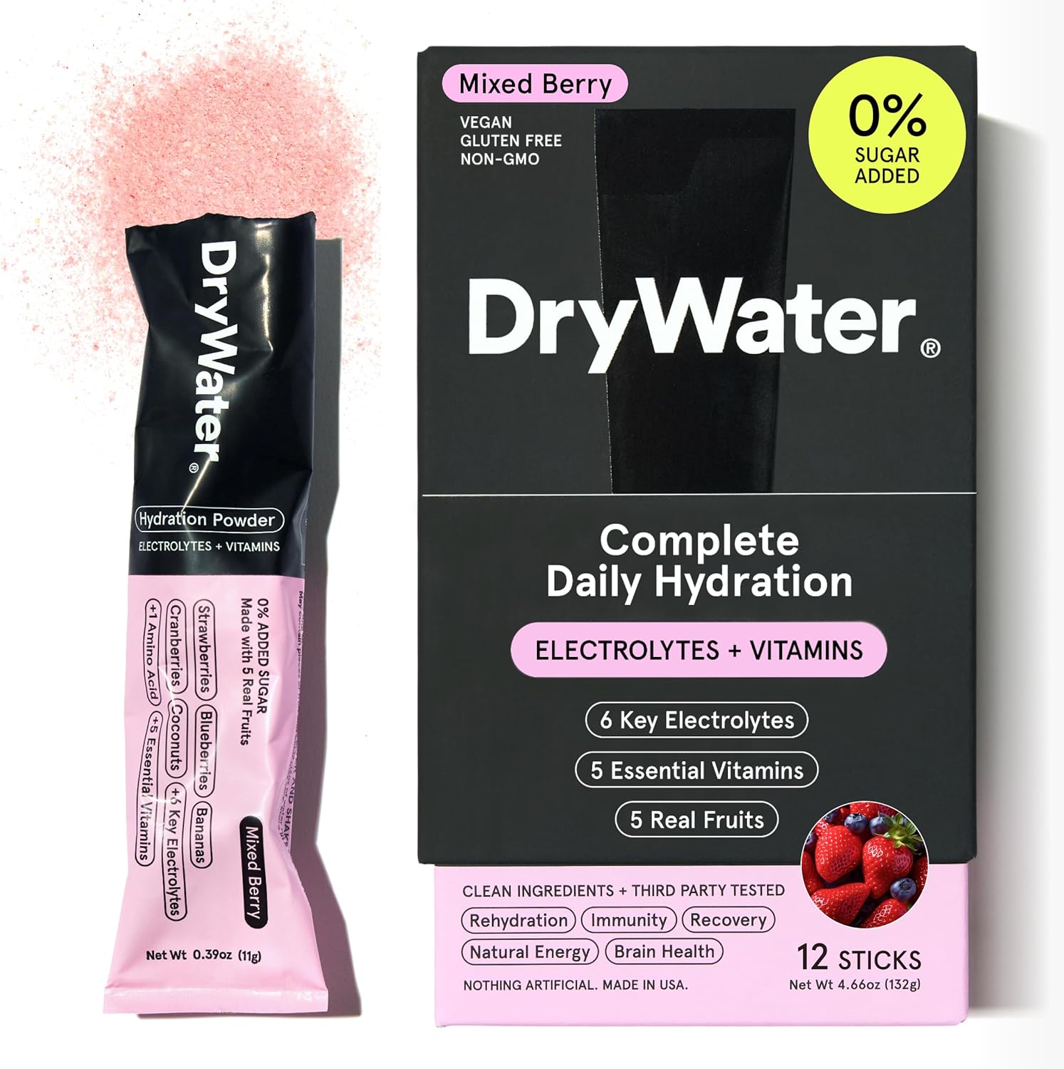- Complete Daily Hydration Powder: Nourish your body with DryWater. Delicious, clean, sugar-free hydration packed with electrolytes including a powerful 1000 mg dose of potassium, vitamins, and real fruit. 12 hydration sticks, Mixed Berry flavor.