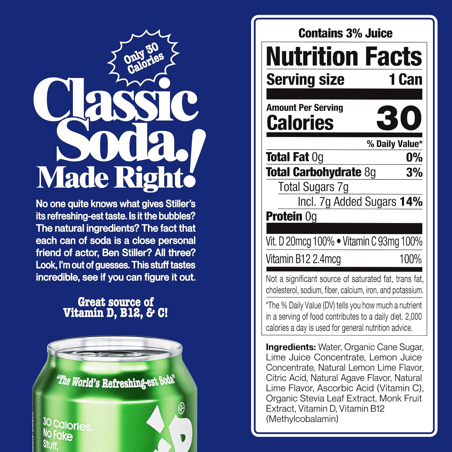 • CLASSIC SODA MADE RIGHT: Stiller's is a refreshing twist on the beloved soda, made with all-natural ingredients. Each can soda contains only 30 calories, 7 grams of sugar, and added vitamins D, B12, and C—making it a natural soda option for fans of sparkling drinks and healthy sodas.